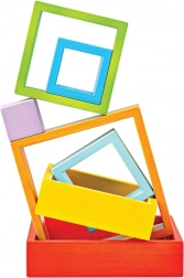 Ta prilagodljiv komplet ponuja neskončno kombinacij – brez navodil, zgolj z domišljijo. Otroci lahko kvadrate vstavljajo po velikosti, gradijo stolpe, ustvarjajo mozaike ter pisane okvirje za svoje stvaritve, po igri pa z njimi okrasijo sobo. Trden les in gladki robovi zagotavljajo prijeten oprijem in dolgo življenjsko dobo igrače.