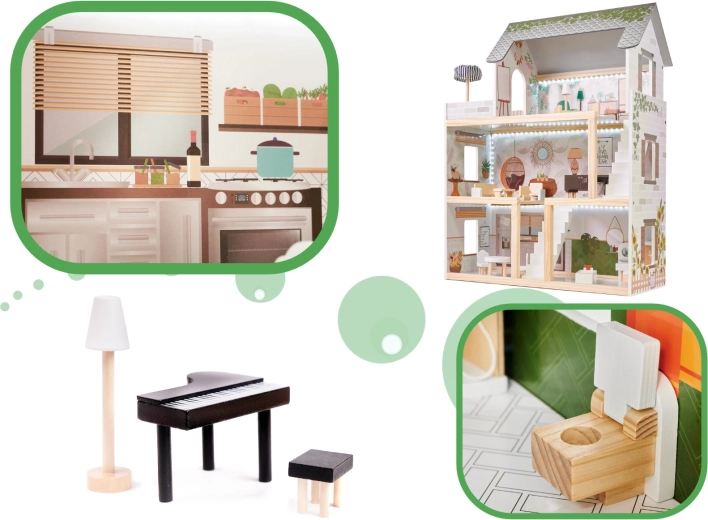 Odkrijte čarobni boho svet z leseno hišico za punčke LULILO FLORO, visoko 78 cm. Trinivojska zasnova s teraso, podrobnimi dodatki in LED osvetlitvijo ustvarja prijetno atmosfero za ure kreativne in domišljijske igre. Skrbno brušen les, pastelne barve in bogata oprema jo spreminjajo v čudovito dekoracijo otroške sobe ter popolno darilo.