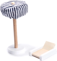 Strešna terasa z ležalnikom in črtastim sončnikom je idealna za sprostitev vaših punčk in dopolni realistične prizore iz življenja.