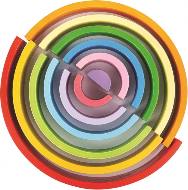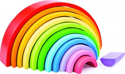 Velika lesena mavrica je brezčasna izobraževalna igrača, ki podpira odprto igro brez pravil. Otroci lahko loke zlagajo, plastijo, povezujejo in kombinirajo z drugimi gradbenimi kompleti – možnosti so praktično neskončne. Zahvaljujoč robustni izvedbi in gladki površini je rokovanje prijetno, mavrica pa prenese vsakodnevno igro.