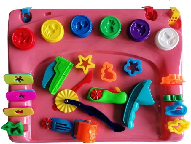 Del kompleta je praktična podloga za modeliranje, ki ščiti delovno površino in zagotavlja stabilno okolje za ustvarjanje. Šest lončkov plastelina v priljubljenih barvah (rdeča, vijolična, modra, rumena, bela, zelena) poskrbi za neskončne kombinacije in navdih.