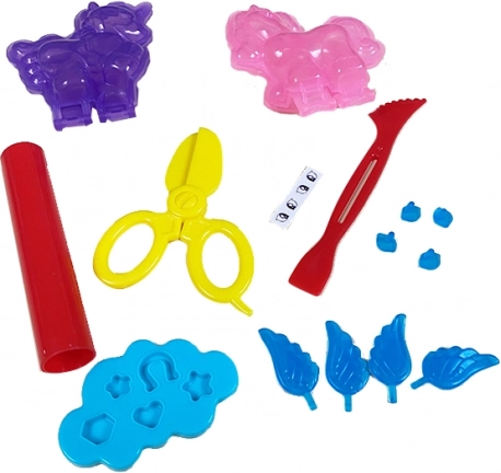 Različni kalupi in orodja, vključno s škarjami in dekorirnim kalupom, omogočajo izdelavo podrobnosti in okrasitev. Otroci bodo pri vsakem ustvarjanju uživali obilo zabave.