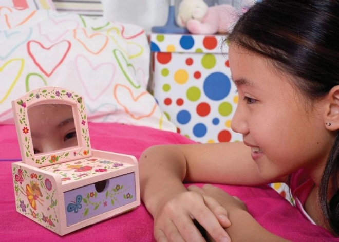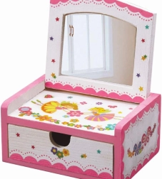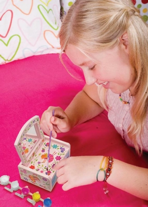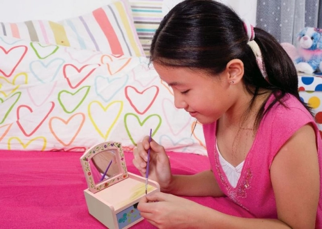 Odkrijte veselje do ustvarjanja s to čudovito kozmetično skrinjico. Ta komplet vam omogoča, da pobarvate in okrasite svojo lastno skrinjico za male zaklade, idealno za ustvarjalne otroke.