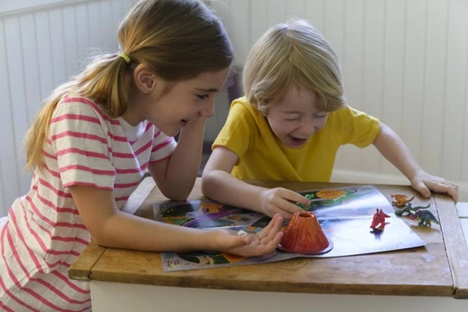 Nariši 6 dinozavrov in vulkan ter lahko igraš pustolovsko igro in povzročiš izbruh vulkana.