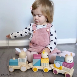 Vlak otrokom služi kot igrača na vrvico, hkrati pa kot natikanka in sestavljanka. Različne kombinacije kock spodbujajo domišljijo, potrpežljivost in koordinacijo.