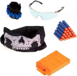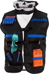 Celovit otroški komplet za penaste puščice: udoben taktični telovnik s pritrdilnimi zankami in žepi, 20 penastih puščic, plastični nabojnik za 6 puščic, zapestni trak za municijo, zaščitna očala v modri barvi in bandana. Telovnik ima dihajočo mrežico, univerzalno otroško velikost in nastavljivo zapiranje na ježka za udobno nošenje.