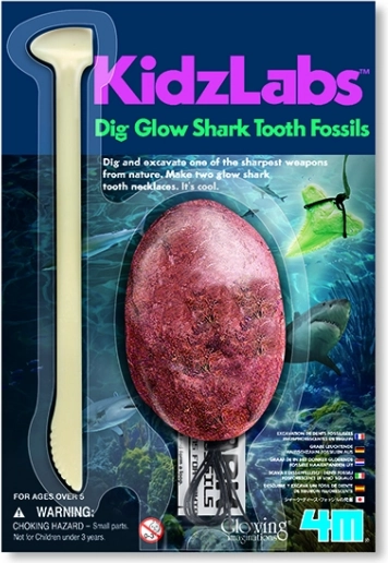 Vsebuje 2 zob(a) morskega psa, ki svetita v temi, ulita v mavčni blok, poseben pripomoček, vrvico in navodila.