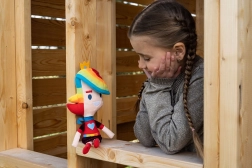 Z dopolnili v mavričnih barvah in prijaznim nasmehom otrokom podarja občutek radosti in varnosti.