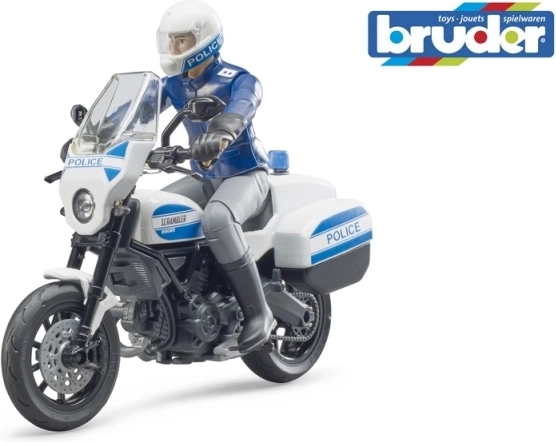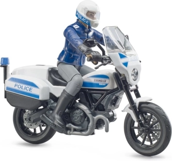 Policijski motor DUCATI Scrambler znamke Bruder je dovršen model za male in velike ljubitelje reševalnih služb. Motor ima vrtljivo krmilo za enostavno manevriranje in zložljivo stojalo za stabilno postavitev. Figurica policista ima premične okončine, zato jo je mogoče namestiti v vozni položaj ali postaviti ob vozilo.
