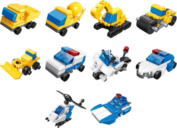 Ta set vključuje 10 različnih modelov, vključno s kombijem, bagrom, patruljnim helikopterjem in drugimi, kar zagotavlja neskončne možnosti za vaše otroke, da razvijajo svojo domišljijo.