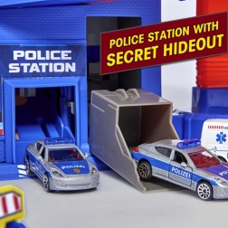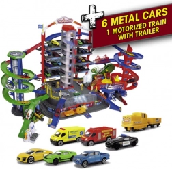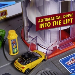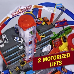 Velika igralna garaža s skoraj 1,30 m širine je največji nov izdelek v svetu Majorette! Garaža je sestavljena iz sedmih igralnih površin in ima do 35 parkirnih in skladiščnih mest. Srce postaje je motorizirano spiralno dvigalo, ki hkrati prevaža do devet kovinskih avtomobilčkov. Ko so na vrhu, avtomatska stikala razporedijo vozila v štiri različne vozne pasove. Šest različnih svetlobnih in zvočnih efektov ter nešteto igralnih postaj, kot so železniška postaja, bencinska črpalka s točilnim avtomatom, avtoservis in avtopralnica, gasilska postaja, policijska postaja s tajnim skrivališčem ali heliport, ponujajo neomejeno zabavo. V kompletu je 6 kovinskih avtomobilčkov, baterijsko gnani vlak, avtomatska kretnica, tunel s funkcijo trka in 2 motorizirani dvigali. Helikopter ni vključen. Dimenzije po sestavi: 128 x 78 x 73 cm.