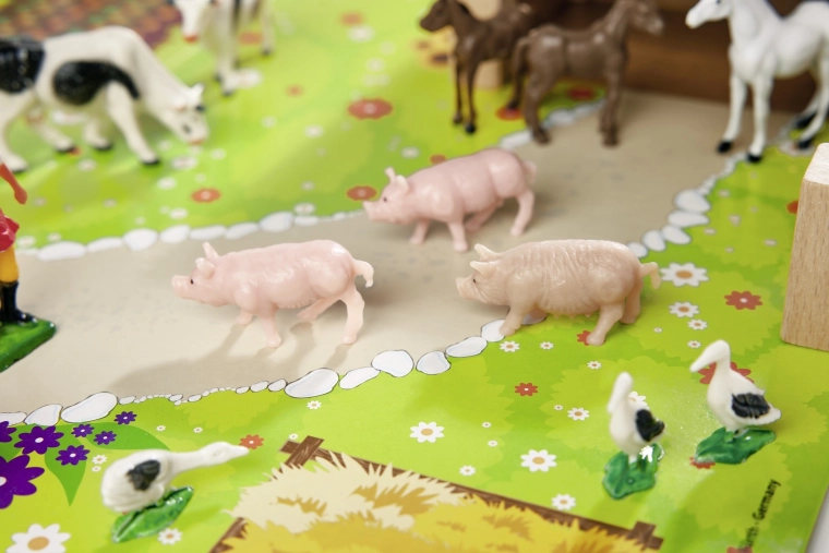 Konji, krave, pujsk,i gosi in skrbnica spodbujajo domišljijo, učijo otroke prepoznavati vrste živali ter razvijajo socialne veščine v okviru igre vlog.