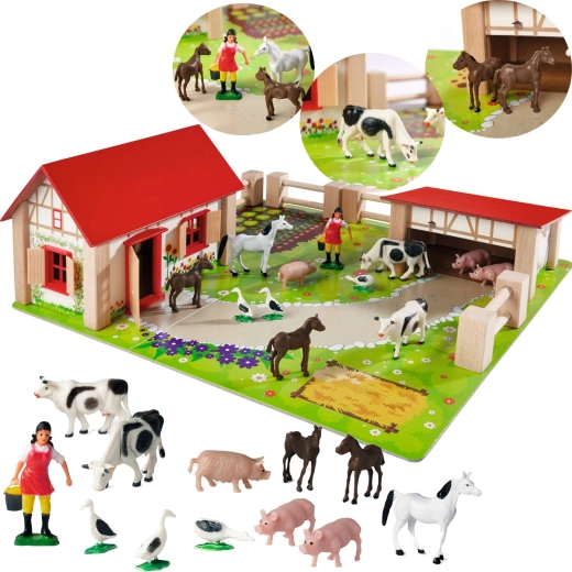 Hiška z odpirajočimi se vrati in okni ter prostoren hlev sta srce kmetije. Les nudi kompletu vzdržljivost in avtentičen videz za dolge ure igre.