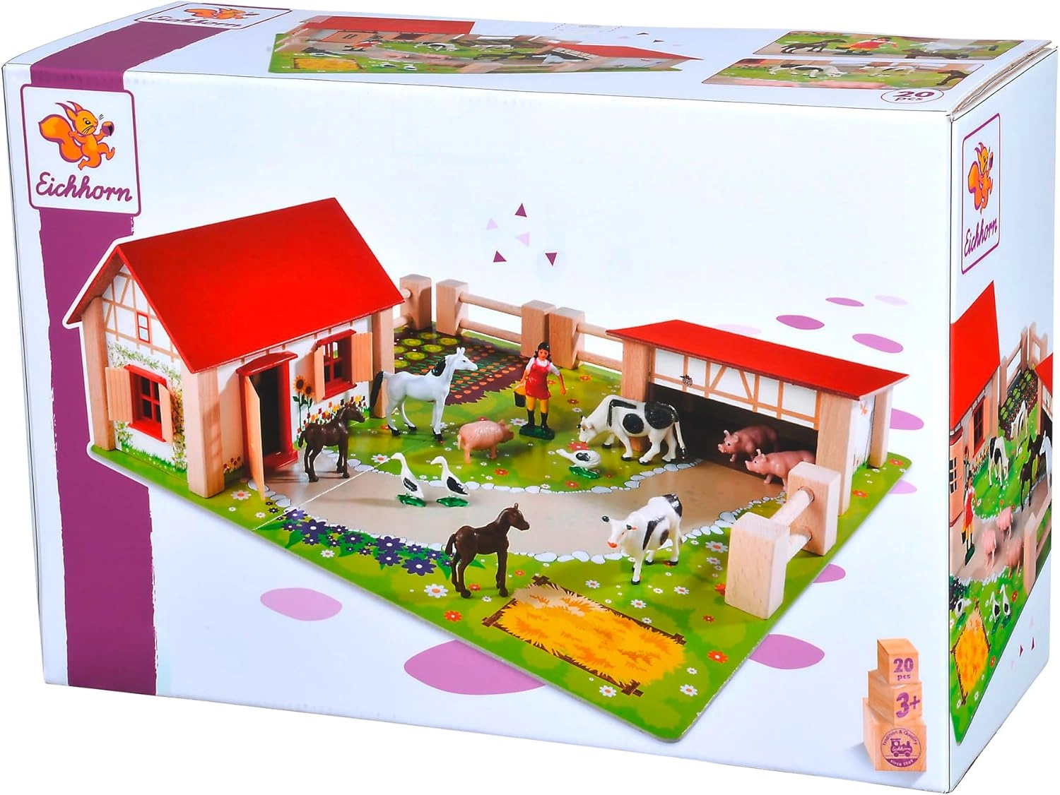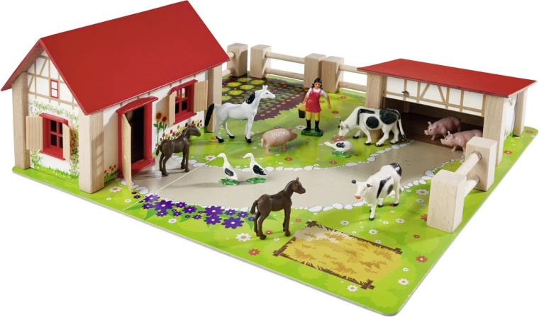 Lesena kmetija EICHHORN bo razveselila vsakega malega kmeta. Set vsebuje hiško z rdečo streho, hlev, ograje ter podrobne figurice živali, vključno s konjički, kravicami, pujsk,i in goskami. Del seta je tudi barvita podlaga s potkami in vrtičkom, ki otroke zlahka usmeri k ustvarjanju lastnih prizorov in zgodb. Trdna lesena konstrukcija in odporni materiali zagotavljajo dolgo življenjsko dobo in varno igro.