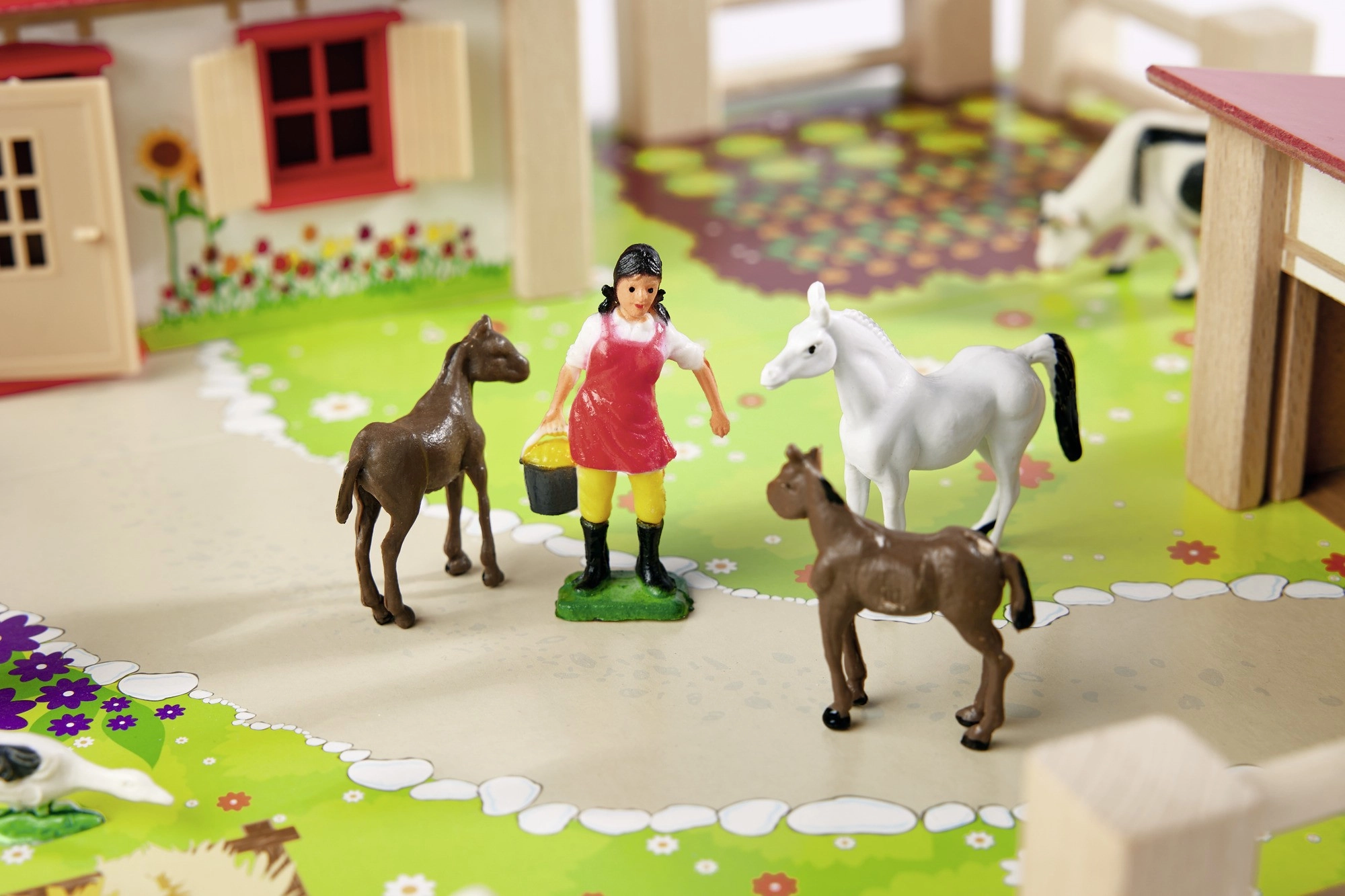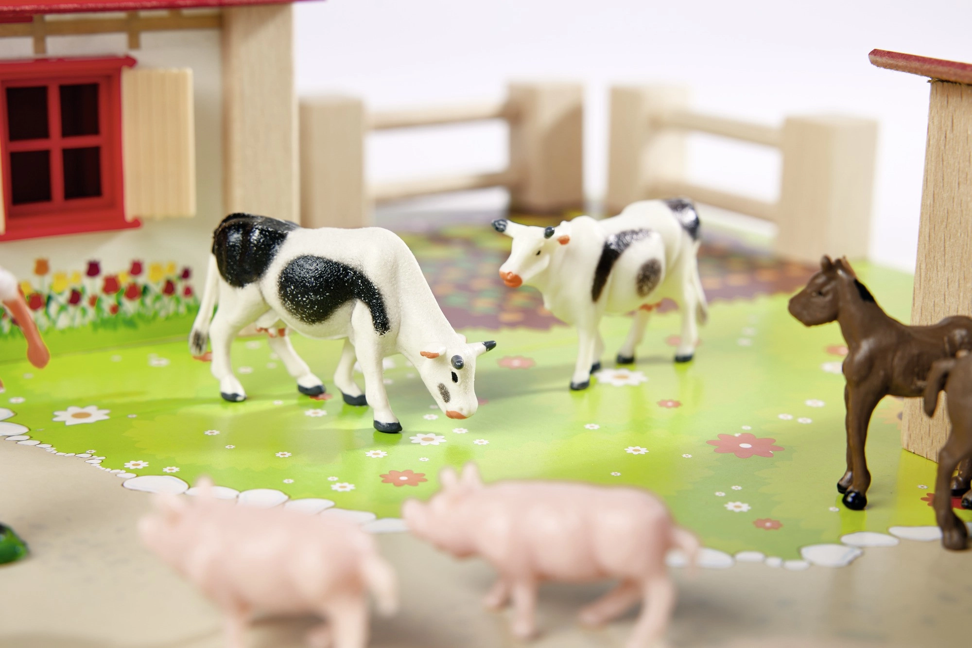 Podlaga s potkami, travo in vrtičkom ter povezljive ograje olajšajo postavitev izpustov in ustvarjanje lastnih kmečkih zgodb.