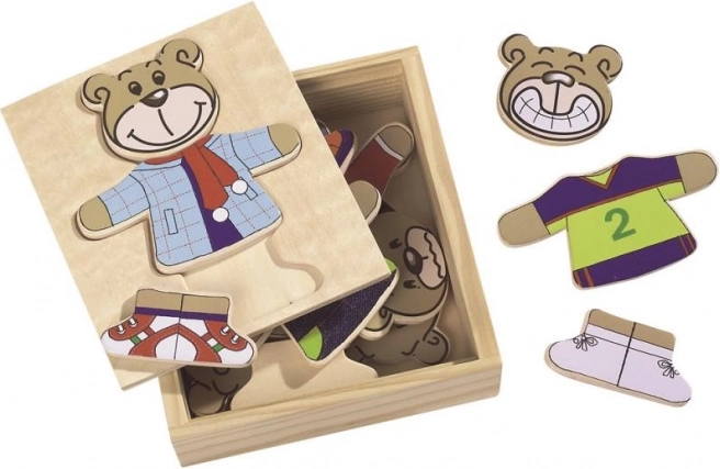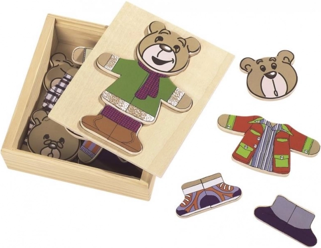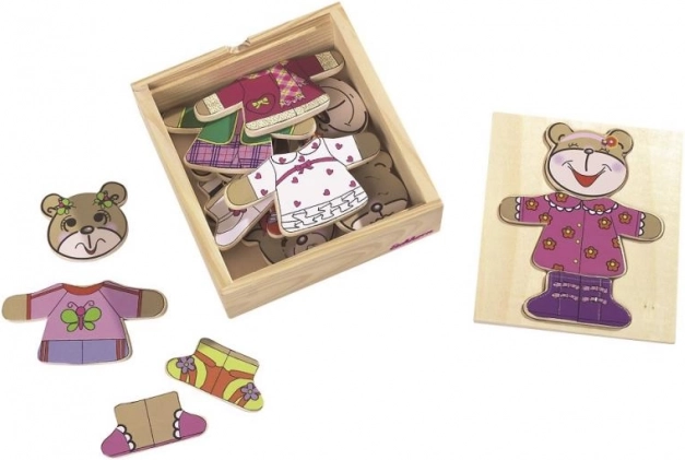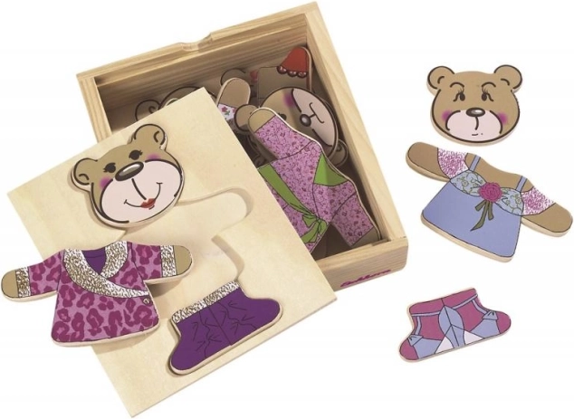 Obleci svojega medvedka s to zabavno sestavljanko! Vsebuje 20 delov in prihaja v praktični leseni škatli.