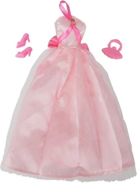 Del oblek so tudi ustrezne visoke pete in torbica, ki dopolnjujejo eleganten komplet za punčke.