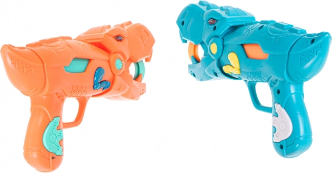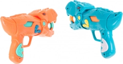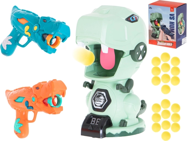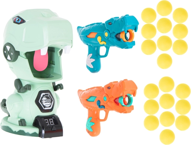 Dve stilizirani pištoli v obliki dinozavrov omogočata streljanje mehkih penastih kroglic varno in učinkovito. Idealno za igre v dvojicah in tekmovanja.