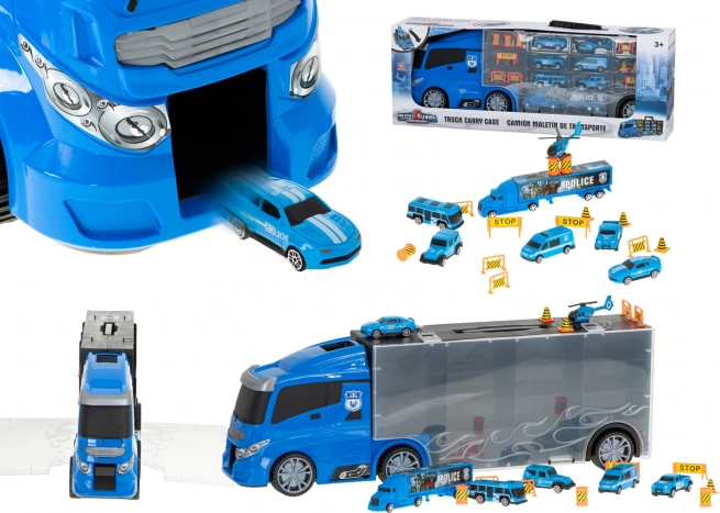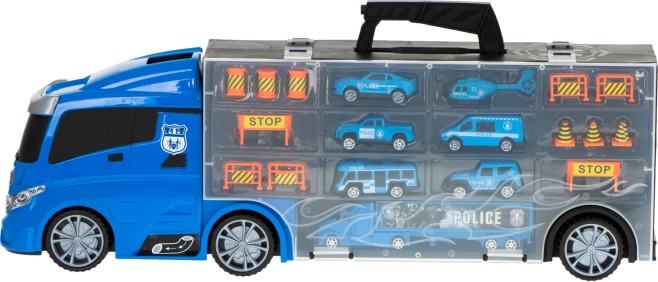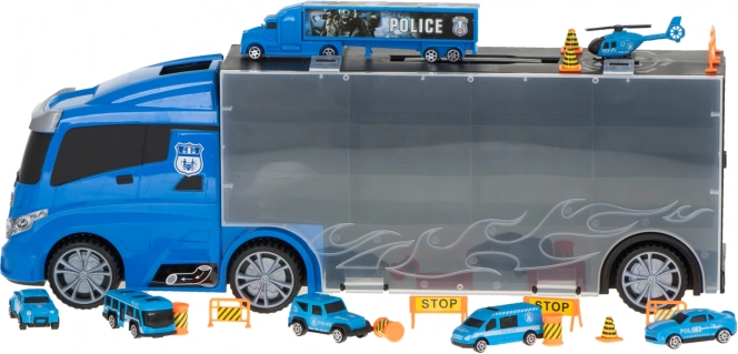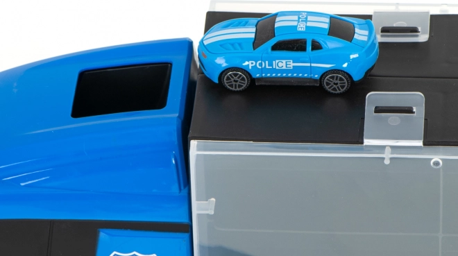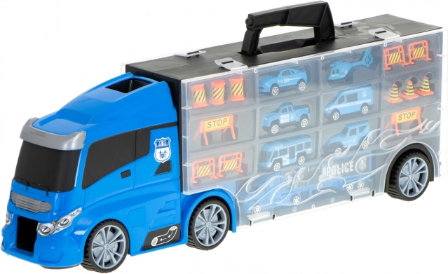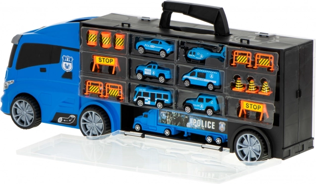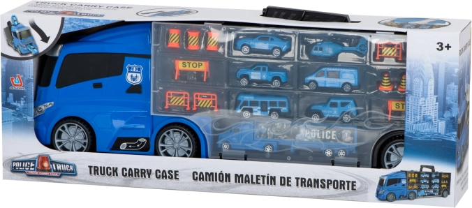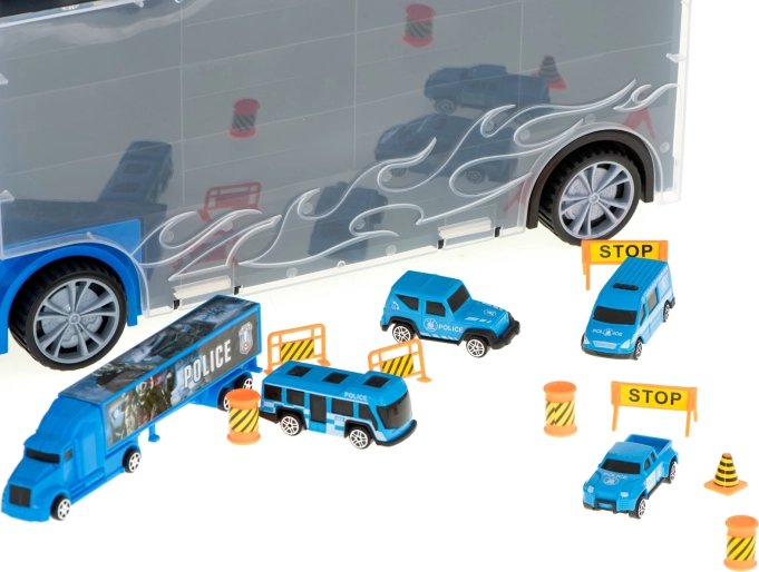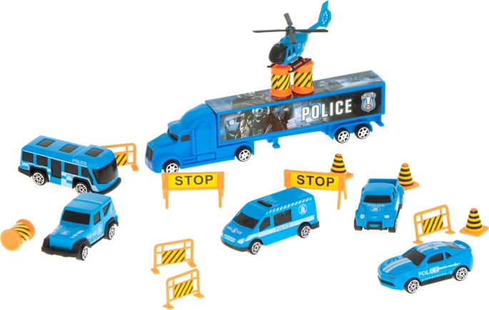 Velik moder policijski tovornjak deluje kot priročen transporter in kovček za avtomobilčke. Pojme do 26 avtomobilčkov, ima odpirajoča se stranska vrata, sprednji izstreljevalnik avtomobilčkov za hitro akcijo in ročaj za enostavno prenašanje. V paketu najdete 6 kovinskih policijskih vozil in helikopter za realistične akcijske igre.