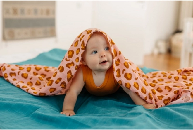 Radodarna dimenzija 120 × 120 cm nudi desetine uporab: od povijanja, preko pokrivanja v vozičku, do slinčka ali podloge. Stilski potisk leoparda v koralnih tonih je paša za oči in lepo dopolni otroško sobico ter komplet za na pot.