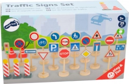 Komplet 25 lesenih prometnih znakov in dodatkov (npr. stožci) otrokom pomaga razumeti pravila cestnega prometa v realističnih igralnih scenarijih. Zaradi berljivih simbolov in stabilnih podstavkov so enostavni za uporabo ter izvrsten dodatek k prometnim preprogam in vlakovnim stezam.