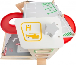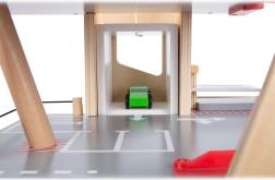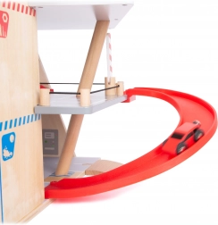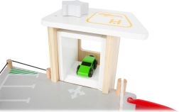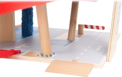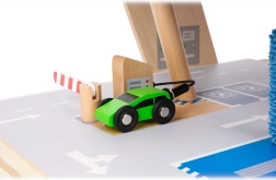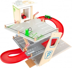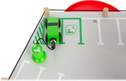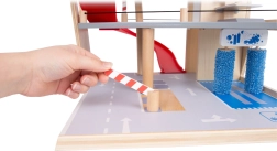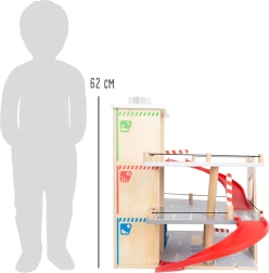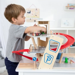 To vrhunsko parkirišče iz kakovostne lesene vezane plošče ponuja tri bogato opremljene nivoje, povezane s funkcionalnim dvigalom in dvema gladkima rampama. Otroci lahko parkirajo, točijo gorivo, polnijo, perejo in tudi popravljajo – vse na enem mestu, z realističnimi elementi in odlično igralnostjo.