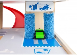 V setu so 2 avtomobilčka, črpalka, polnilna postaja, dvižna rampa, avtopralnica s krtačami in tri zapornice. Nadstropja imajo gumijasto ograjo proti izpadanju vozil, površine pa so bogato označene z ikonami in prometno signalizacijo. Konstrukcija je trdna, vzdržljiva in varna, zahteva preprosto montažo s slikovnim navodilom.
