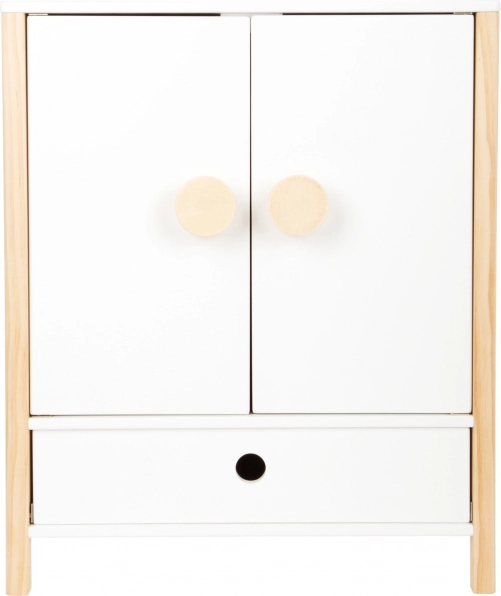 Ohranite oblačila in dodatke za punčke popolnoma urejene z prostorno leseno omarico v skandinavskem dizajnu. Ponuja obešalno palico z obešalniki, odstranljive police in praktičen predal. Zaradi zaobljenih robov in nevtralnih barv se odlično poda v vsako otroško sobo ter spodbuja učenje reda in razvoj skrbstvenih veščin.