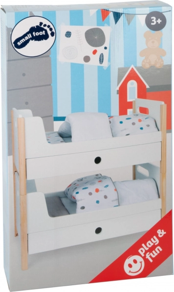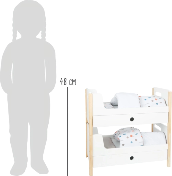 Del paketa je posteljnina v nevtralnih barvah ter prevelike odeje, ki udobno namestijo punčke ali plišaste igrače do 46 cm. Predalčki pod vsako posteljo ponujajo pameten prostor za oblačila in drobne dodatke. Idealen dodatek za otroško sobo in za stilski kotiček za punčke v okviru kolekcije Little Button.
