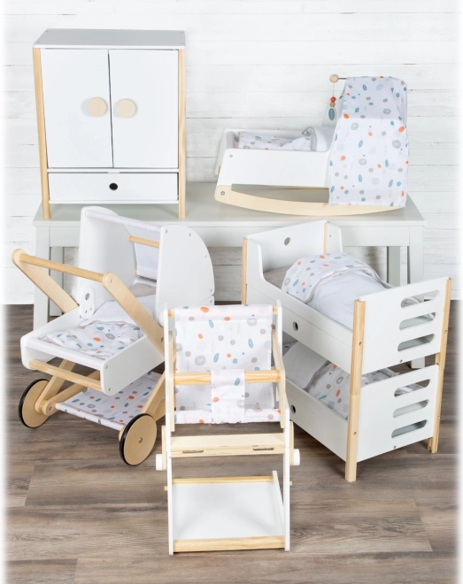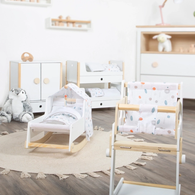 Stilska zibelka za punčke v nordijskem slogu za otroke od 3 let. Ponuja stabilno leseno konstrukcijo, zibajoče sani, zlahka snemljiv baldahin in obojestransko, spolno nevtralno posteljnino. Pod veliko odejo udobno spijo punčke in plišasti prijatelji do 46 cm. Elegantni pastelni toni in zaobljeni robovi se odlično podajo v sodobno otroško sobo.