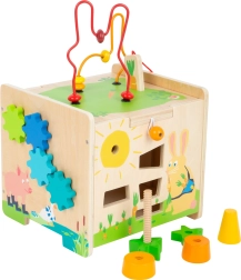 Ta kakovostna lesena motorična kocka z motivi zajčka in njegovih prijateljev motivira otroke k raziskovanju, uri koordinacijo oko–roka ter podpira prvo glasbeno zaznavanje zahvaljujoč vgrajenemu ksilofonu. Zgornji del s krogličnim labirintom je mogoče zlahka sneti in obrniti, da kocka zavzame manj prostora, po potrebi pa jo lahko praktično uporabite kot stolček.
