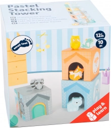 Zložljivi stolp »Pastel« združuje čvrste kartonske kocke z lesenimi živalicami v sodobnem pastelnem dizajnu. Vsaka stran kock ponuja namig za pravilen vrstni red, zato se otroci skozi igro učijo razvrščanja in prostorskega zaznavanja. Zahvaljujoč okencem in vratcem lahko živalice »stanujejo« v notranjosti, kar spodbuja domišljijo in igro vlog.