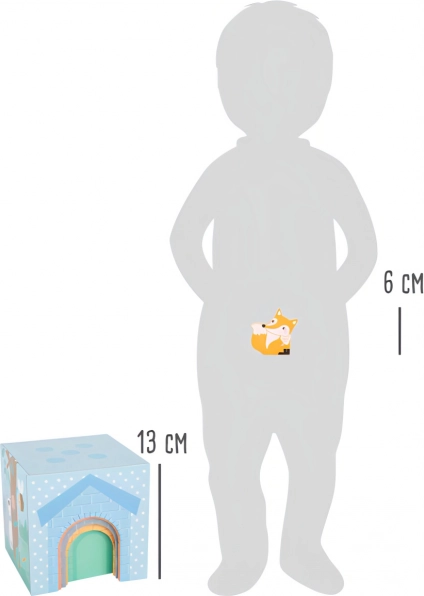 Kocke lahko postavite v visok stolp ali jih vstavite eno v drugo. Okenca in vratca vabijo k skrivalnicam z živalicami ter razvijajo domišljijo in fino motoriko.