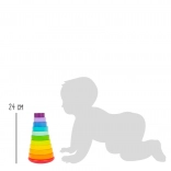 Z desetimi pisanimi diski in palico z zaobljeno osnovo ta stolp podpira razvoj motoričnih spretnosti in razlikovanje barv.