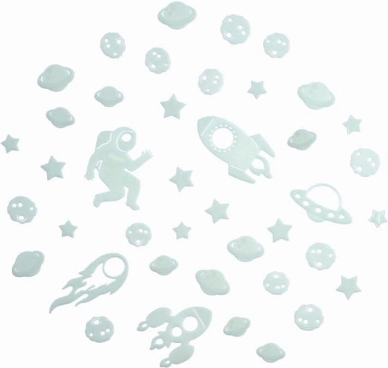 S tem vesoljskim kompletom boste v otroški sobi zlahka pričarali čarobno nočno nebo. Dekoracije je treba le osvetliti in njihov fosforescenčni učinek poskrbi za nežno svetlikanje, ki spodbuja domišljijo in mirno uspavanje.