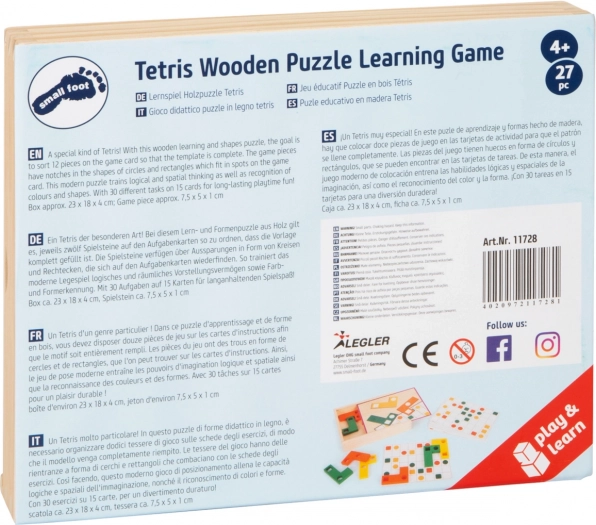V paketu najdete praktično leseno škatlo z drsnim pokrovom, ki varno shrani vse komponente. Igra je odlično darilo in dopolnilo drugim izobraževalnim igram SMALL FOOT. Spodbuja samostojno igro in skupno reševanje nalog s starši.