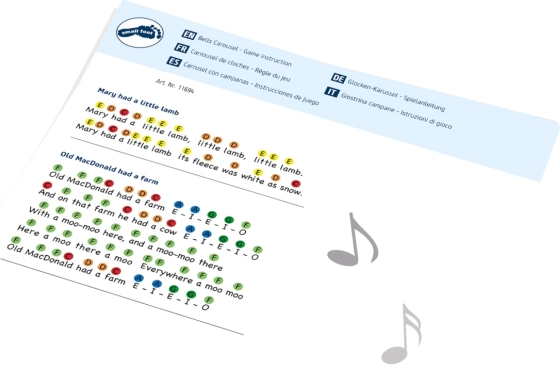 V paketu so paličica in barvno označene note z osmimi znanimi skladbami, kot so »Striček Donald je imel kmetijo«, »Zvončki« ali »Svetleči se, zvezdica«. Igranje na zvončke razvija glasbeno zaznavanje, motoriko in spodbuja zbranost – odlično za igranje doma ter za uporabo v vrtcih in na 1. triadi OŠ.