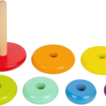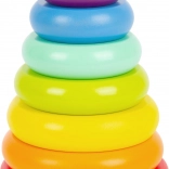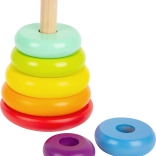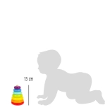 Ta zložljivi stolp omogoča otrokom prepoznavanje in razvrščanje raznobarvnih obročev po njihovi velikosti in barvi. Zahvaljujoč zaobljeni osnovi se lahko stolp ziblje, kar prinaša dodatno radost in zabavo pri igri. Robustna lesena konstrukcija je idealna za dolgotrajno zabavo, tudi za najmlajše.