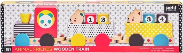 Ta sodoben leseni vlak ima lokomotivo in dva vagončka, štiri kocke s številkami ter dva prikupna živalska prijatelja. Otroci ga lahko vlečejo za vrvico, gradijo in premeščajo kocke ter figurice, pri tem pa razvijajo domišljijo, logiko ter fino in grobo motoriko.