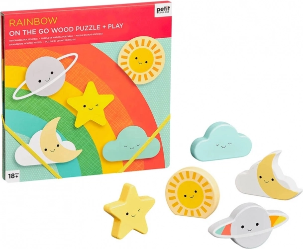 Odporne lesene sestavljanke za najmlajše od 18 mesecev. 5 lesenih koščkov, 2 igralni prizori in vesel motiv mavrice spodbujajo fino motoriko, osredotočenost in veselje do odkrivanja. Izdelano iz lesa in recikliranega papirja.