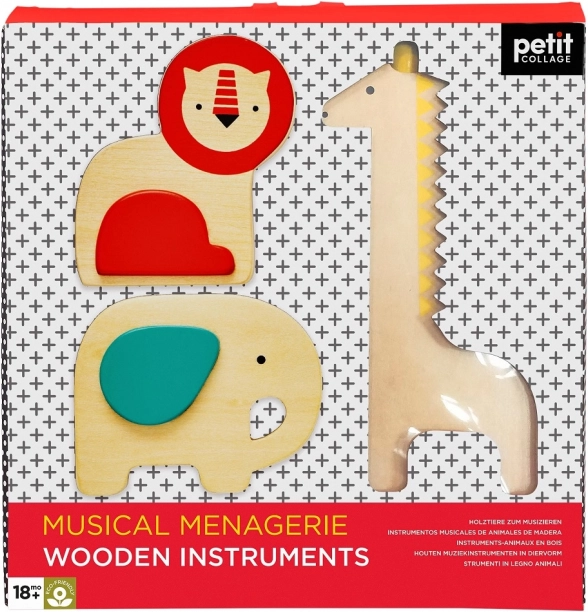 Prisrčen komplet lesenih glasbil za najmlajše spodbuja ritem, sluh in fino motoriko. Vsebuje žirafin guiro ter dve rumba krogli (slon in lev). Izdelano iz FSC lesa, potiskano z barvami na vodni osnovi in dobavljeno v reciklabilni embalaži; varno od 18 mesecev.