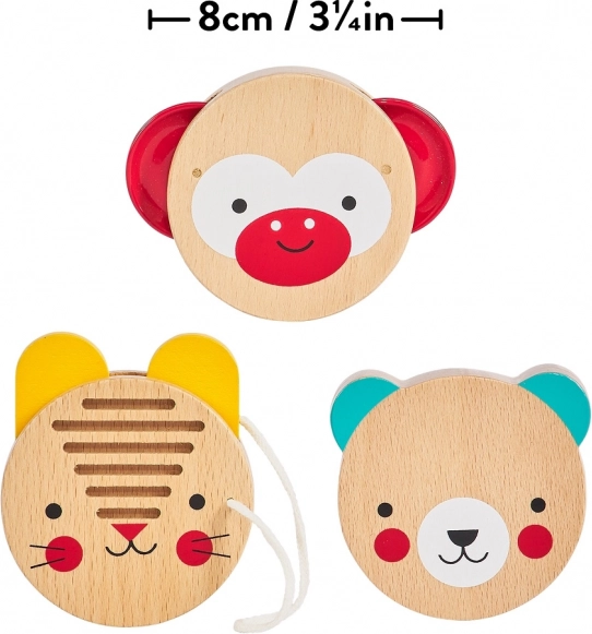 Tri preprosta tolkala z motivi živalic spodbujajo naravni občutek za ritem in veselje do muziciranja že v zgodnjem otroštvu.