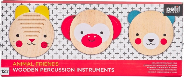 Ta igriv komplet treh tolkalskih instrumentov Petit Collage je idealen uvod v svet glasbe. Veseli motivi živalic (opica, medved in zajček) spodbujajo otroke k odkrivanju ritma in zvokov, kar podpira naravni razvoj sluha in senzoričnega zaznavanja.