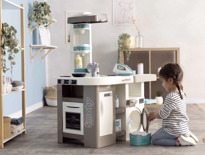 Večnamenska otroška kuhinjica SMOBY TEFAL Studio 2 v 1 združuje kuhanje, pranje in likanje v enem igralnem setu. Ponuja elektronsko kuhalno ploščo z zvoki, pečico, hladilnik, pomivalno korito in kavni avtomat, hkrati pa tudi pralnico s pralnim strojem, sušilnim stojalom in likalno desko z mehansko likalnikom. Del kompleta je 36 dodatkov za realistično igro in razvoj otroške domišljije.