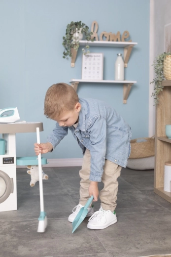 Pralni stroj z odpirajočimi se vrati in predalom za detergent dopolnjuje likalna deska z mehansko likalnikom, sušilni stojalo in koš za perilo – popolna skrb za perilo v otroški velikosti.