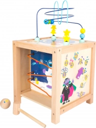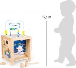Ta večstranska kocka je idealno orodje za razvoj otrok, saj ponuja pet različnih strani, polnih zanimivih aktivnosti. Z barvnimi liki in prijaznimi motivi kocka pomaga otrokom učiti se in eksperimentirati v varnem okolju.