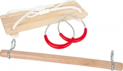 Ta večnamenski set za male akrobate prinaša aktiven gib in veselje na vrt in v otroško sobo. Klasična lesena gugalnica, viseča bradljička in gimnastični krogi z udobnimi plastičnimi oprijemi spodbujajo razvoj koordinacije, moči in ravnotežja.
