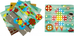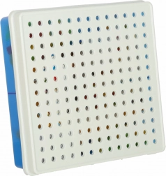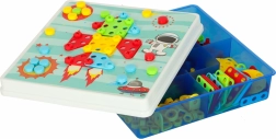 Perforirana plošča in kartice s slikami pomagajo zlahka sestaviti rakete, živalice in lastne zamisli; učenje oblik in barv je prava igra.