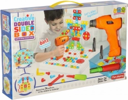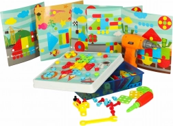 Set z mozaik ploščo omogoča otrokom, da s pomočjo otroškega vrtalnika, izvijača in ključa privijajo barvite vijake ter ustvarjajo raznolike slike in prostorske modele. Prebudite otrokovo domišljijo – edina meja je domišljija malega konstruktorja.