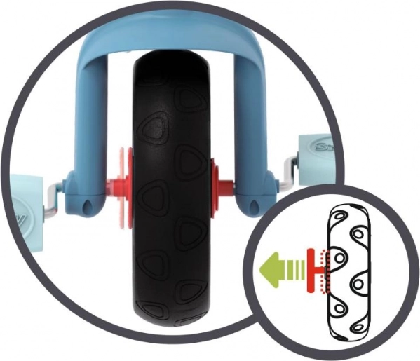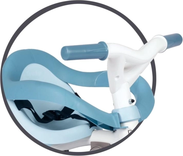 Tricikel vključuje varnostne pasove in blokirne mehanizme za maksimalno varnost in nadzor med vožnjo.